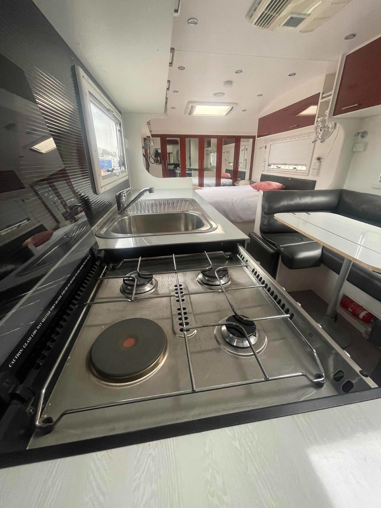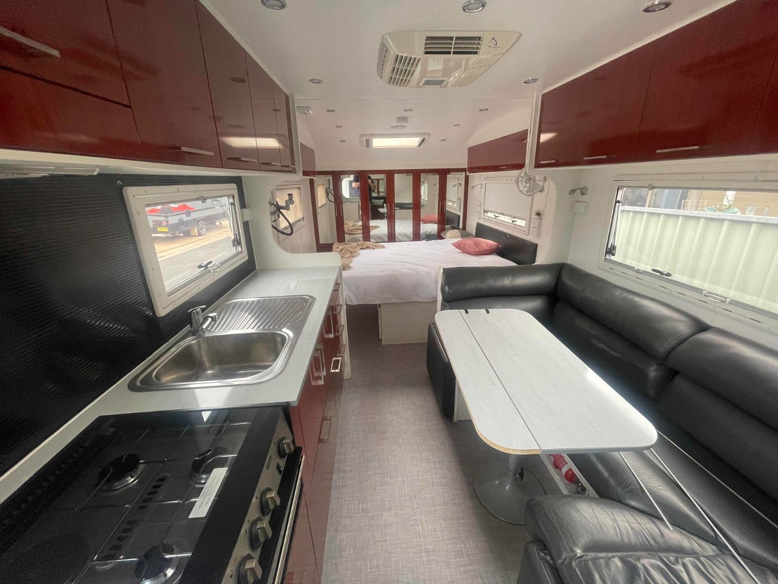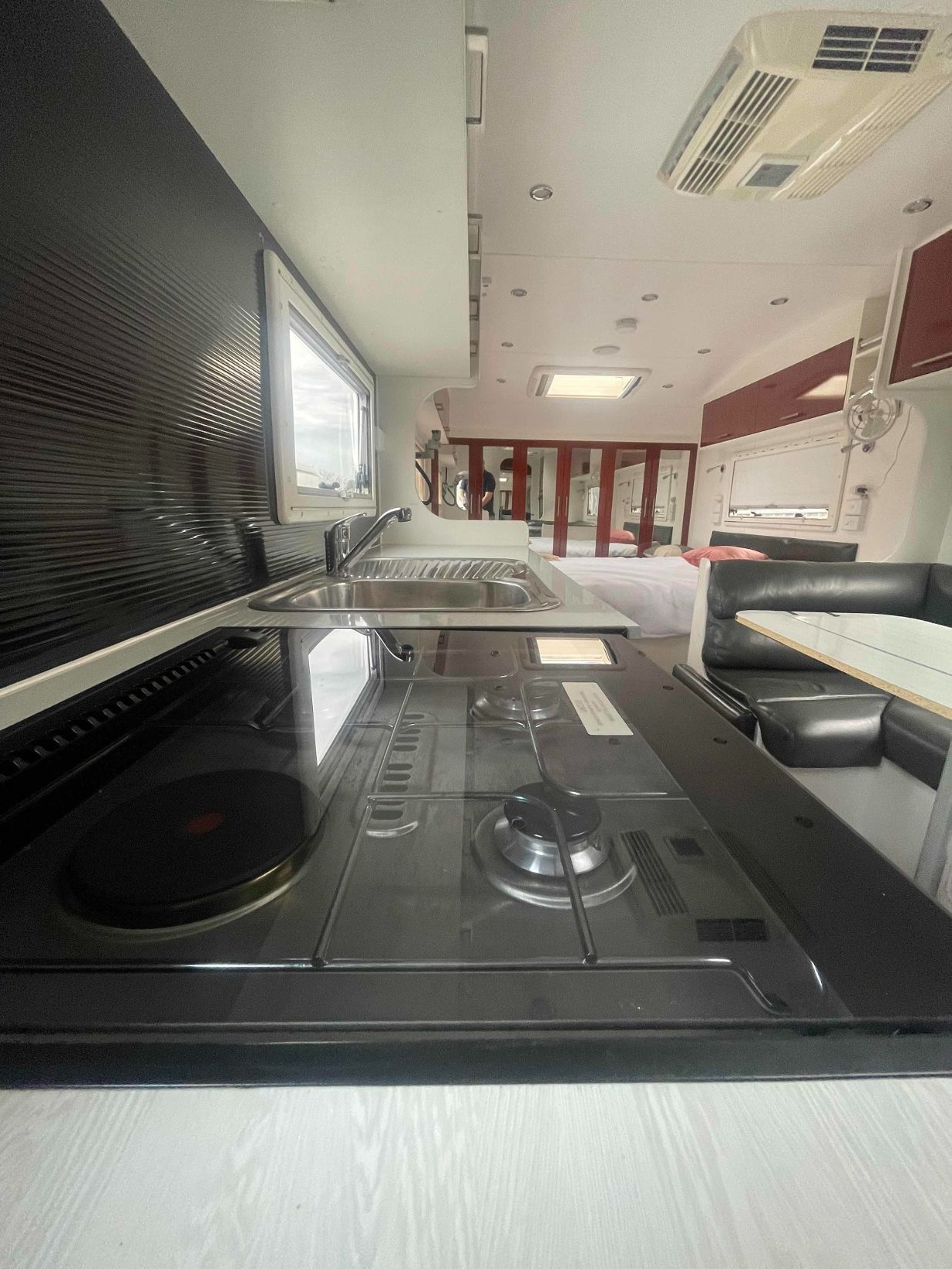 A Kitchen in a Camper With a Stove, Sink, and Bed — B & C Caravan Service Pty Ltd In Dubbo, NSW