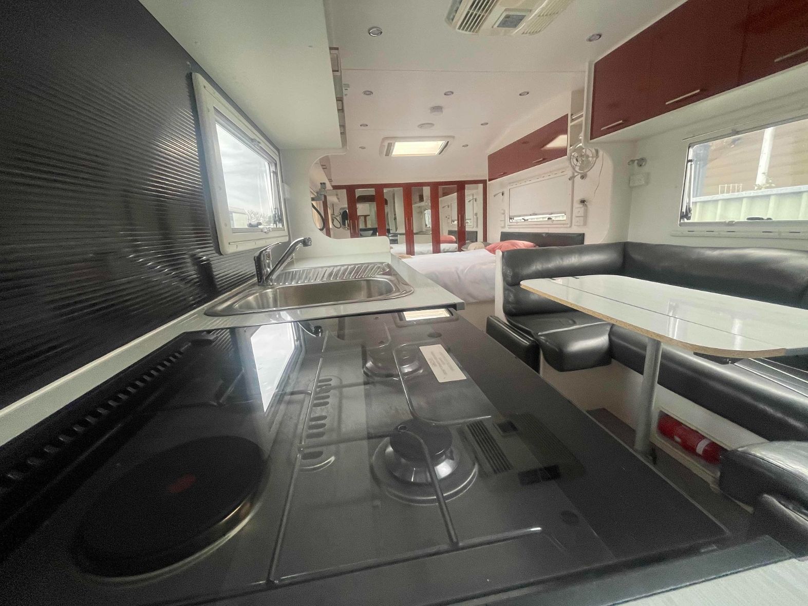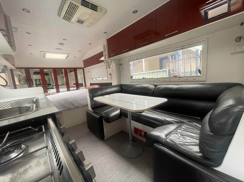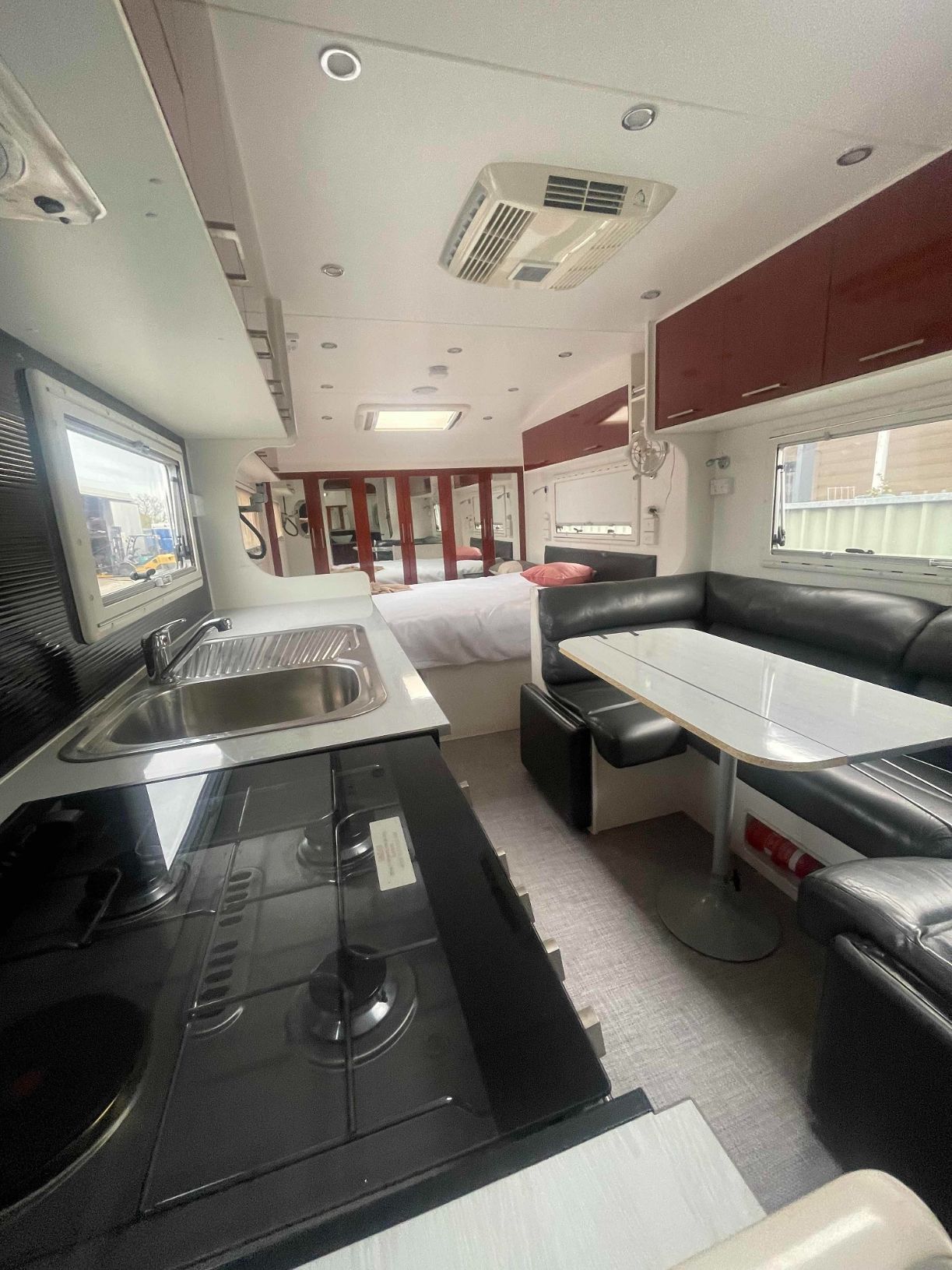 A Kitchen in a Camper With a Stove, Sink, and Bed — B & C Caravan Service Pty Ltd In Dubbo, NSW