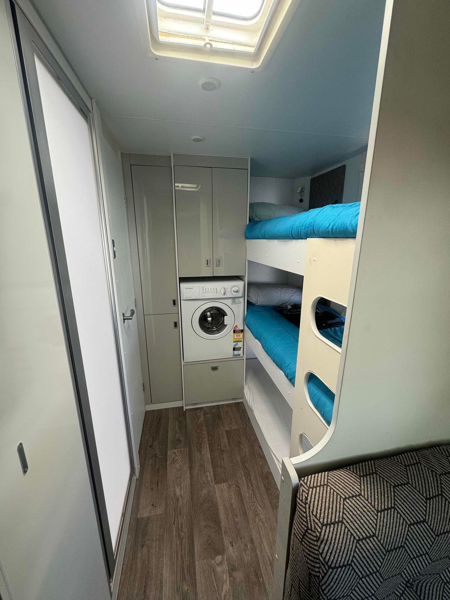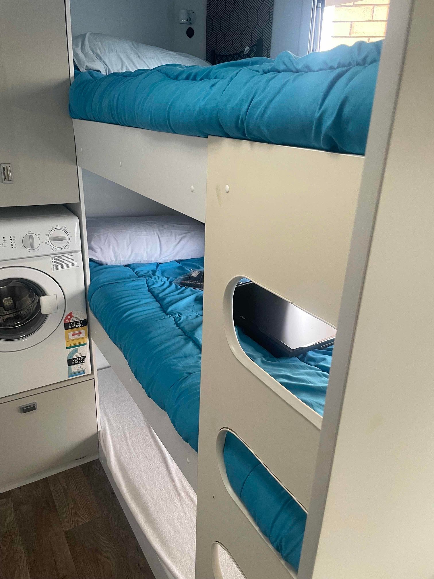 ✔ Sleeps 5 comfortably – queen island bed + 3 bunks